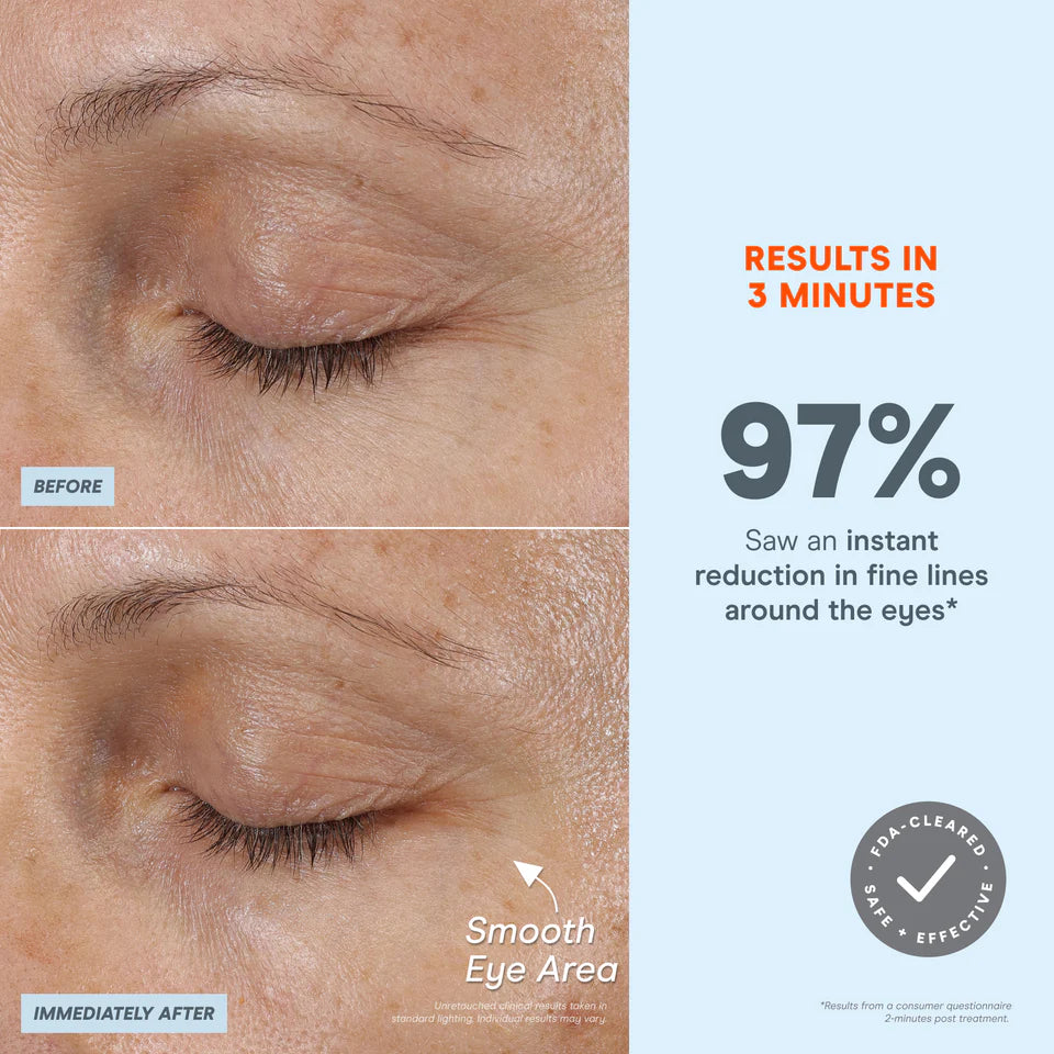 • Device targets fine lines and wrinkles around eyes, mouth, forehead, and nasolabial folds by instantly firming, smoothing, and tightening the look of skin